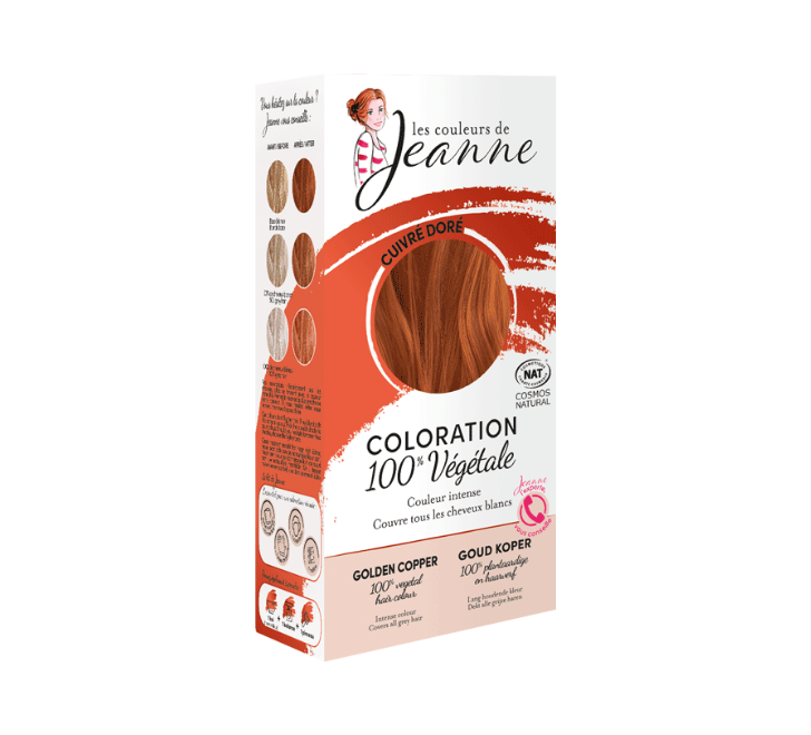 La Coloration végétale cuivré doré de la marque Les Couleurs de Jeanne se compose de poudres 100% pures et végétales.